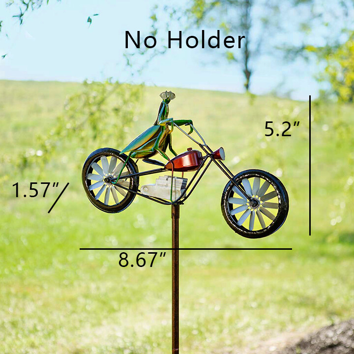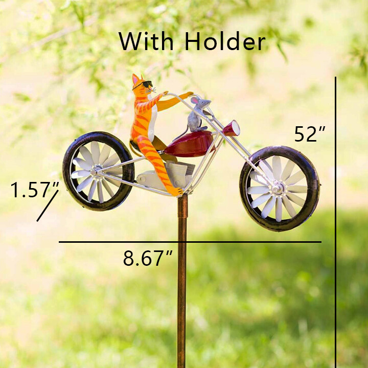 The spokes of his enormous front wheel will spin in the breeze and cause his legs to move up and down in a peddling motion.