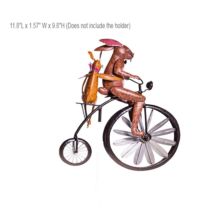 It only takes a slight breeze to get the wheel spokes to spin, and the driving bunny's jointed legs move along as if he's pedaling.