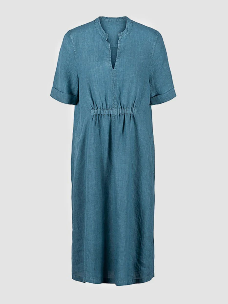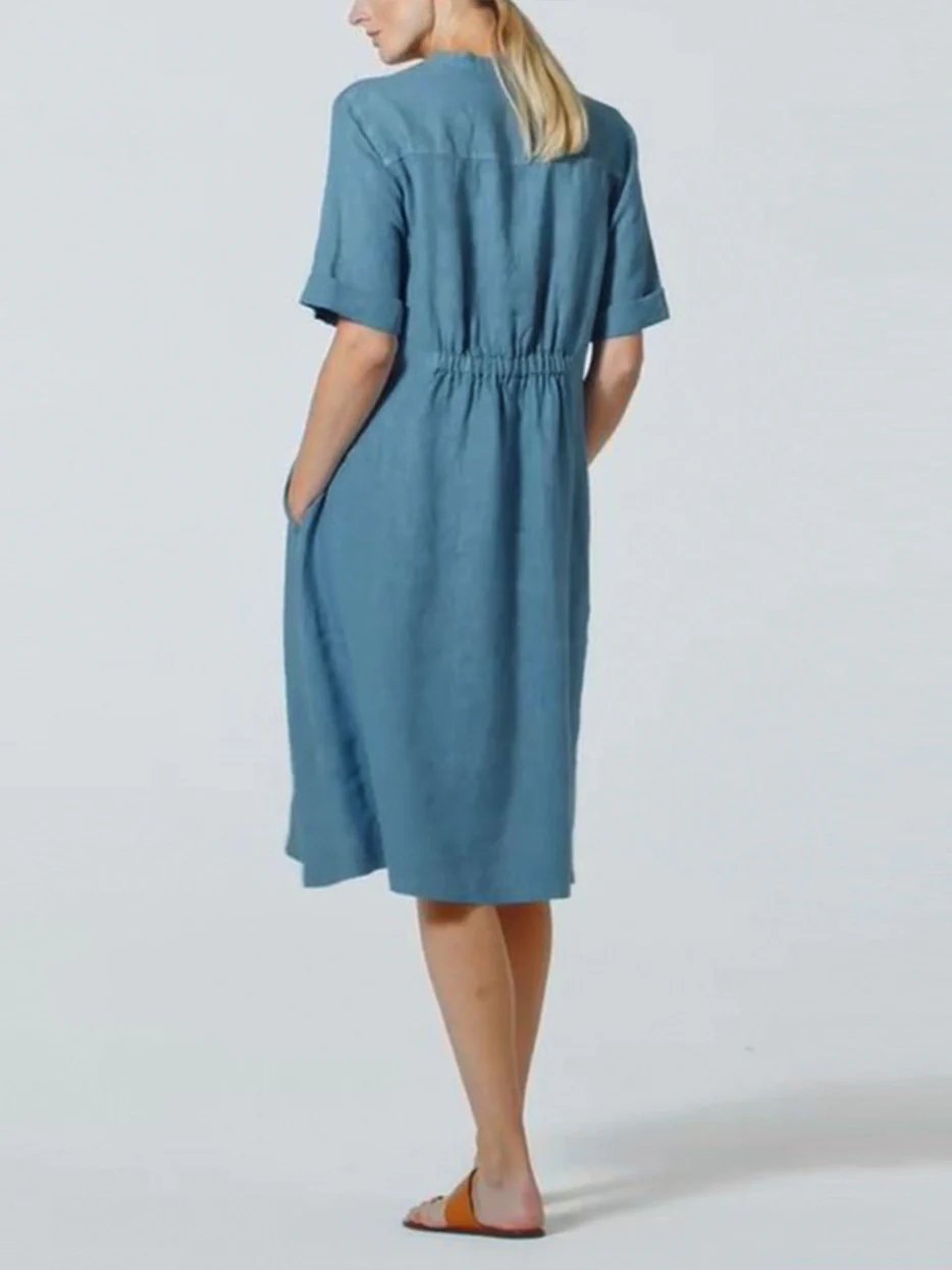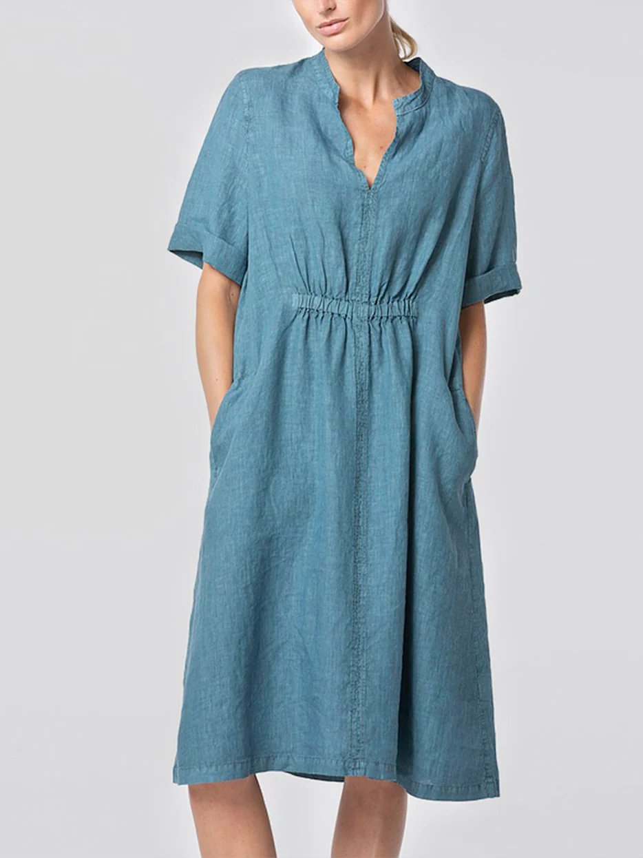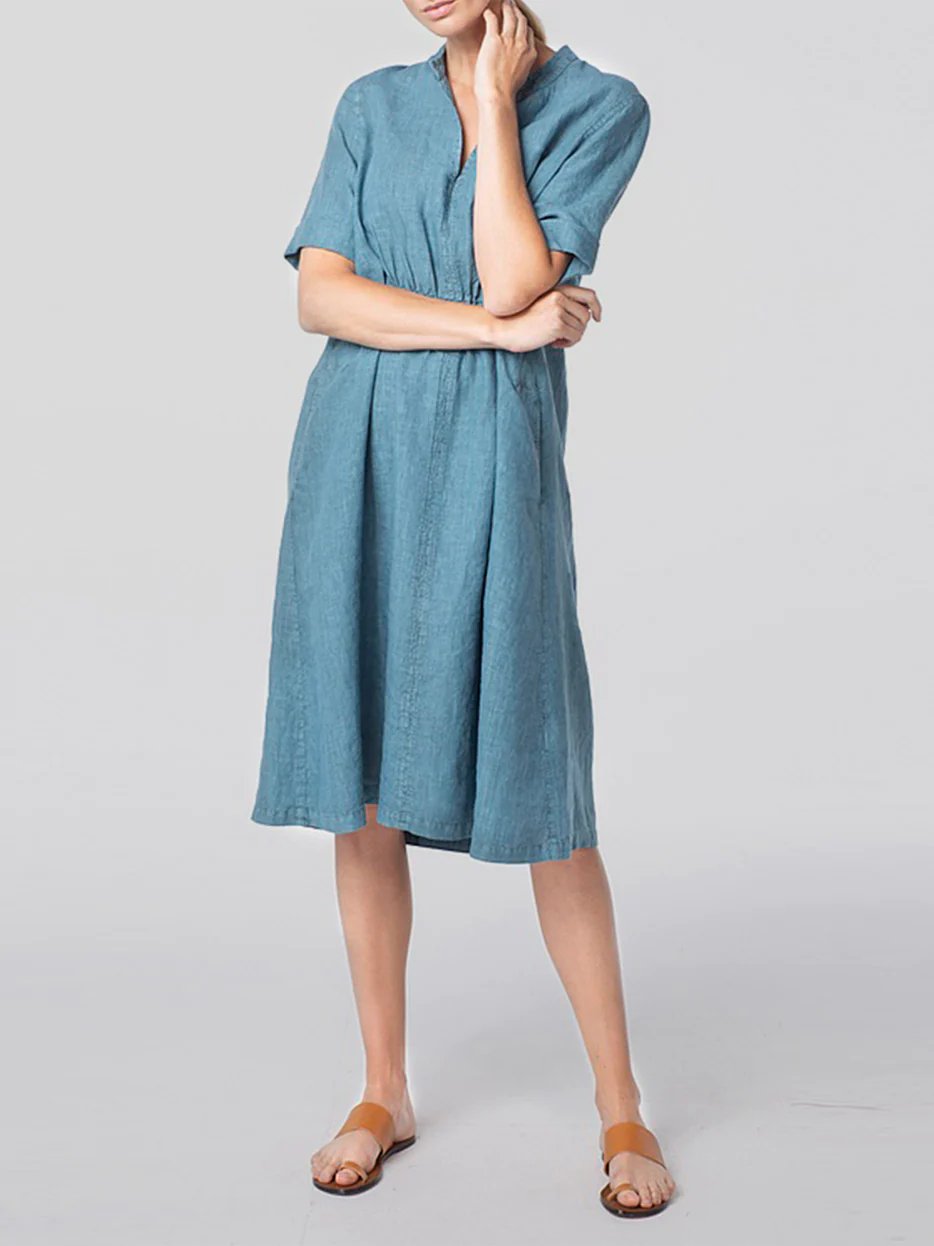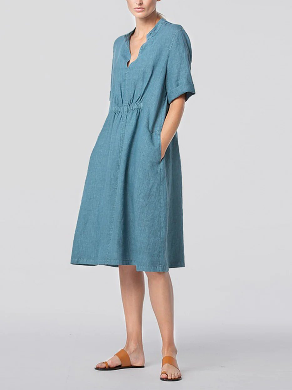 Cotton-Linen V-neck Elastic Waistband Dress