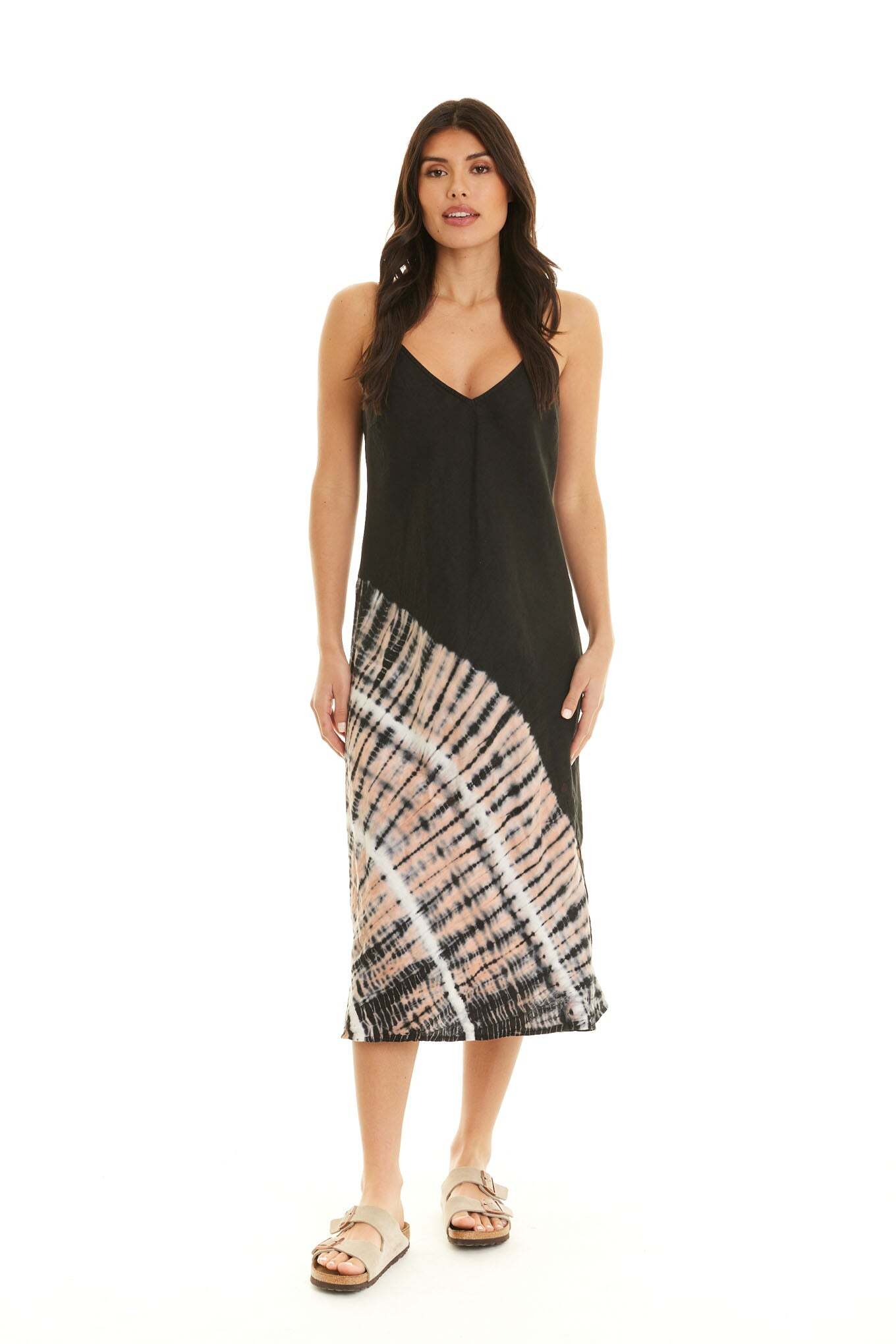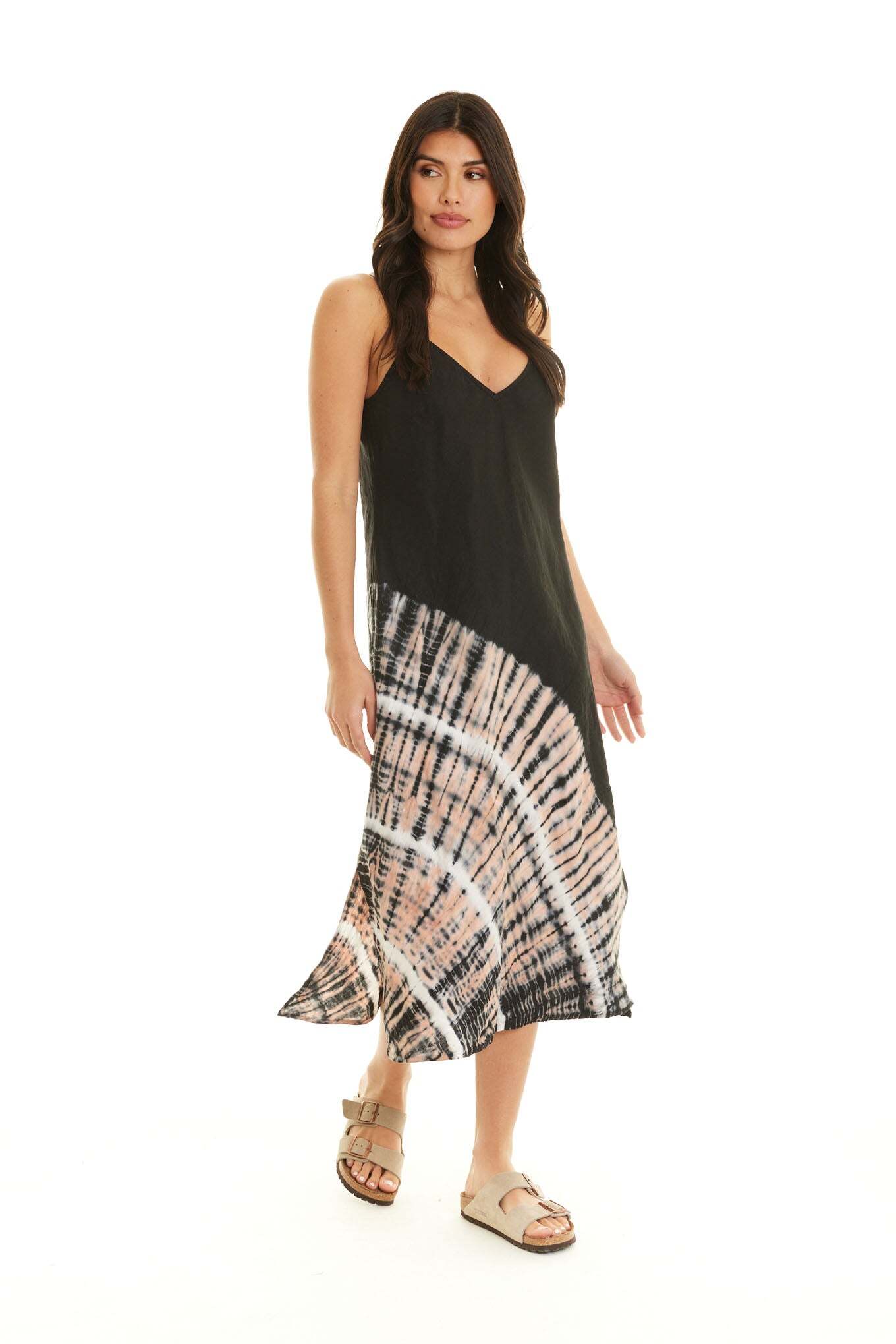 Our unique linen bias v-neck midi length dress with adjustable straps makes for a flattering dress that is ready to go when you are!