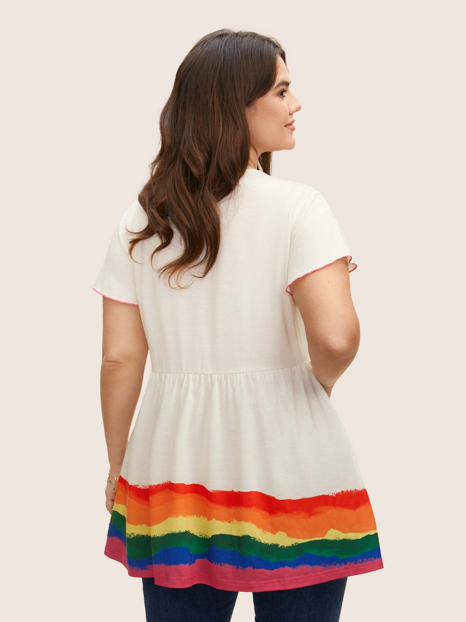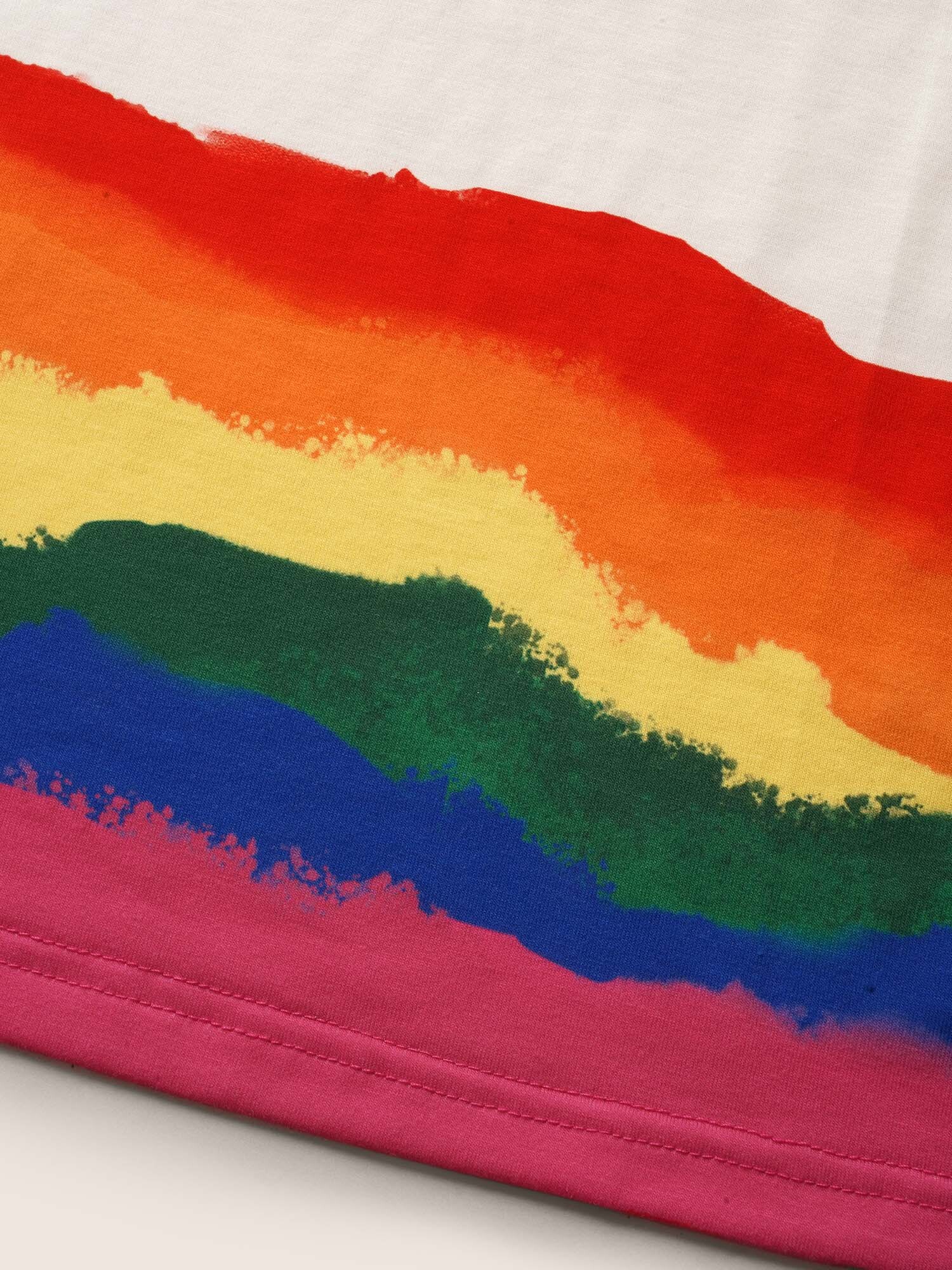 It has wavy color strips and colorful hem for a relaxed feeling, with doll-style design for inclusiveness and loose waist design for extra comfort.