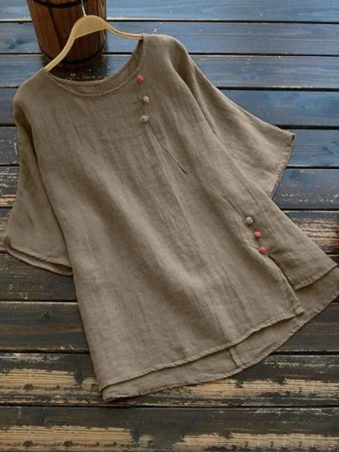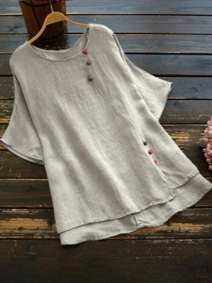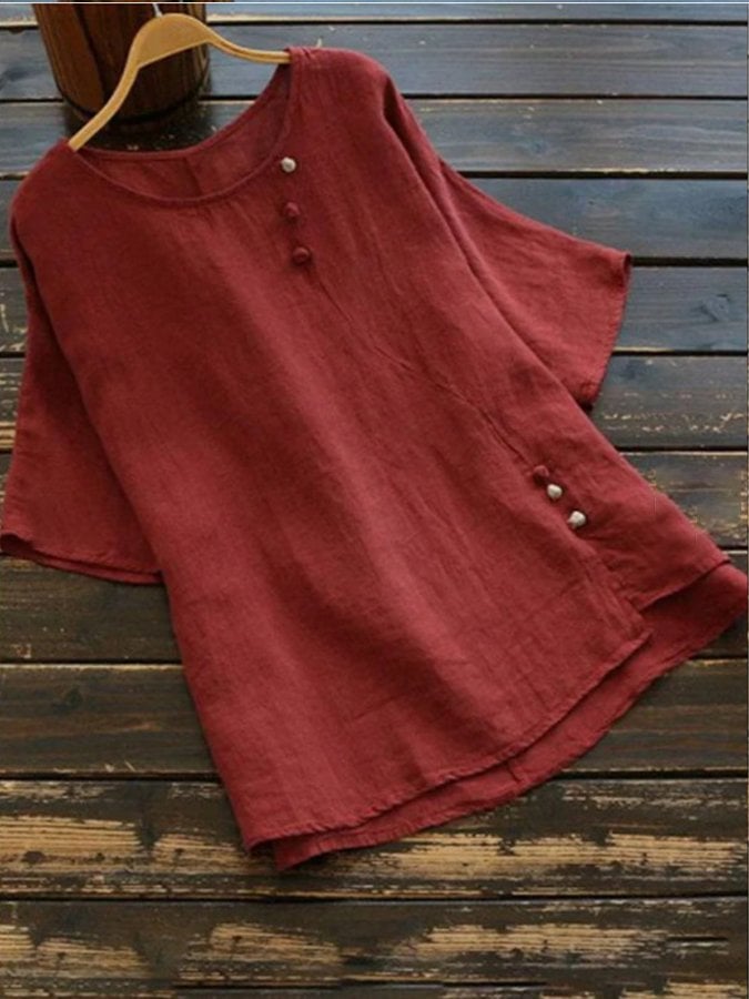 • Women's Solid Cotton Linen Round Neck Split T-shirt